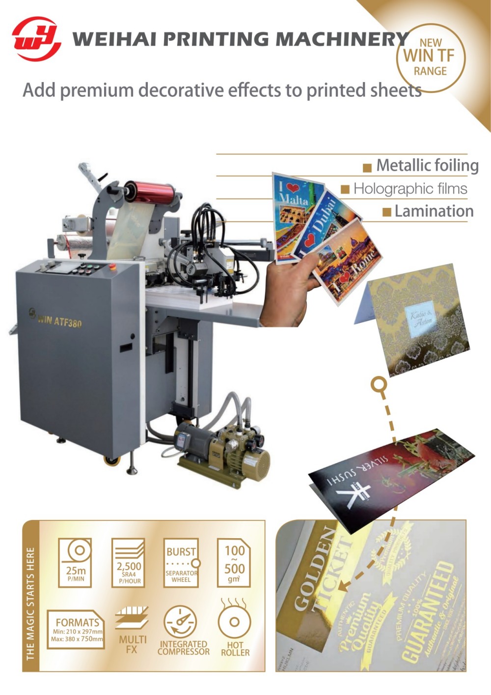 Mesin Laminating dan Foiling Press Lembaran 380mm mampu melakukan hot stamping pola metalik dan warna secara otomatis tanpa pelat hot stamping tradisional. Cocok tidak hanya untuk aplikasi digital on-demand jangka pendek namun juga untuk keluaran offset litograf tradisional. Ia menggunakan film holografik untuk secara otomatis membuat pola titik dan riak air, membuat bahan cetakan menjadi lebih indah.