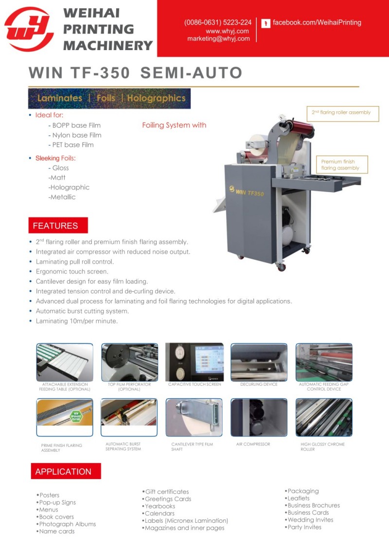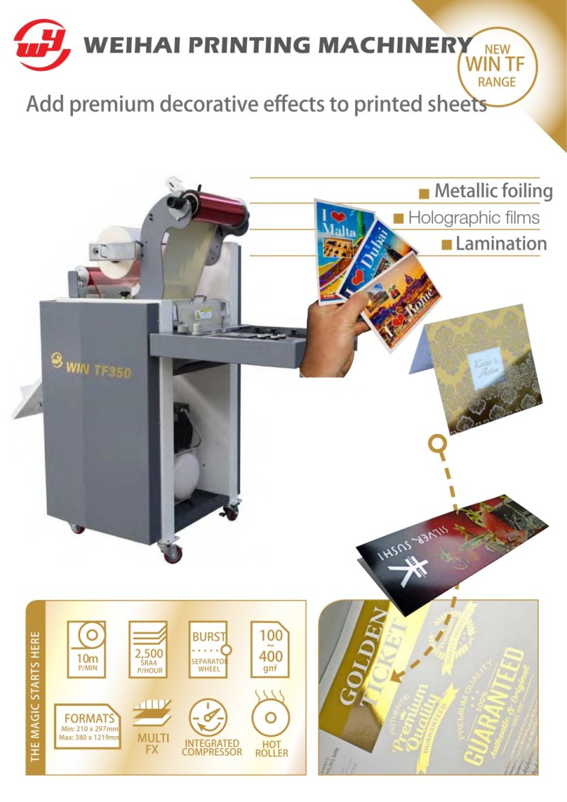 WIN menyediakan Mesin Laminating dan Foiling profesional (TF350/ATF380), juga disebut Mesin Laminating dan Foiling Bebas Pembuatan Plat, yang terhubung secara mulus dengan Digital Press dan Sheet-Fed Digital Inkjet Press. Peralatan pasca-cetak berefisiensi tinggi ini mengintegrasikan fungsi laminating, hot stamping, dan cold foiling. Ini dapat mengaplikasikan film glossy, matte dan laser, serta stamping foil logam yang presisi dalam satu kali lintasan. Dengan kontrol suhu dan tekanan yang tepat, Mesin Laminating dan Foiling ini memastikan efek stamping yang bebas gelembung, bebas warp, dan kokoh. Mendukung pengumpanan kertas otomatis, pengangkutan stabil, dan registrasi presisi tinggi, sangat meningkatkan penampilan dan nilai tambah produk cetakan. Tahan lama dan mudah dioperasikan, Mesin Laminating dan Foiling ini banyak digunakan untuk kartu nama kelas atas, kotak hadiah, sertifikat, sampul buku, dan materi promosi premium.